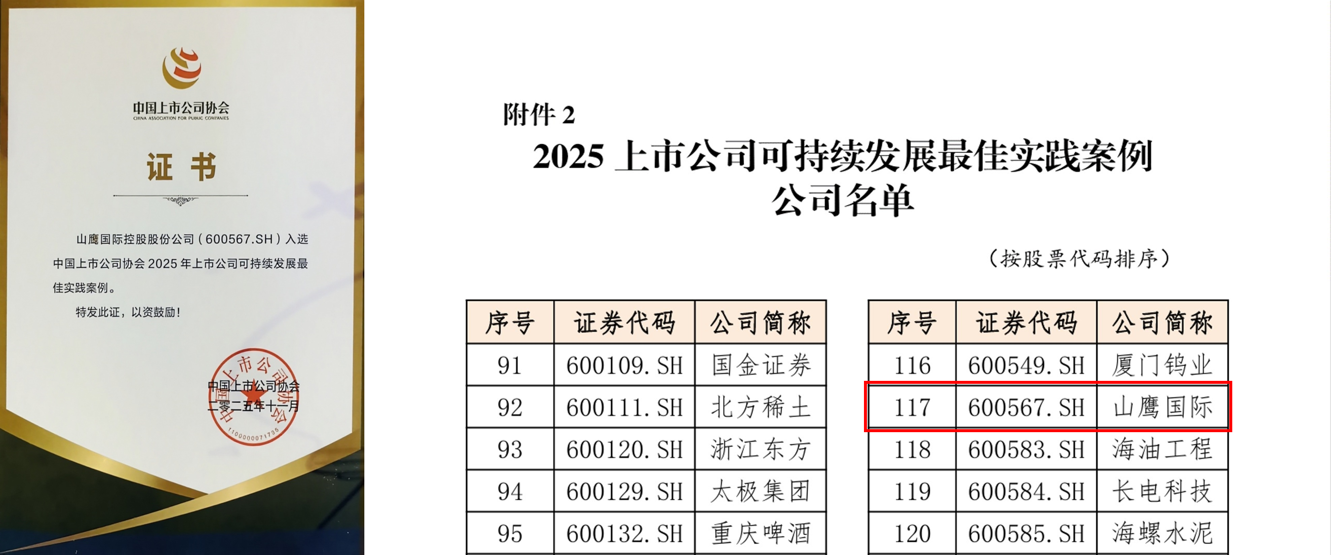 近日,在2025中国上市公司可持续发展大会上,山鹰国际凭借“深化‘碳’究,携手全链路减碳新征程”实践案例,成功入选大会发布的“2025上市公司可持续发展最佳实践案例”榜单,其在环境(E)、社会(S)及公司治理(G)领域的探索与成效再获认可。