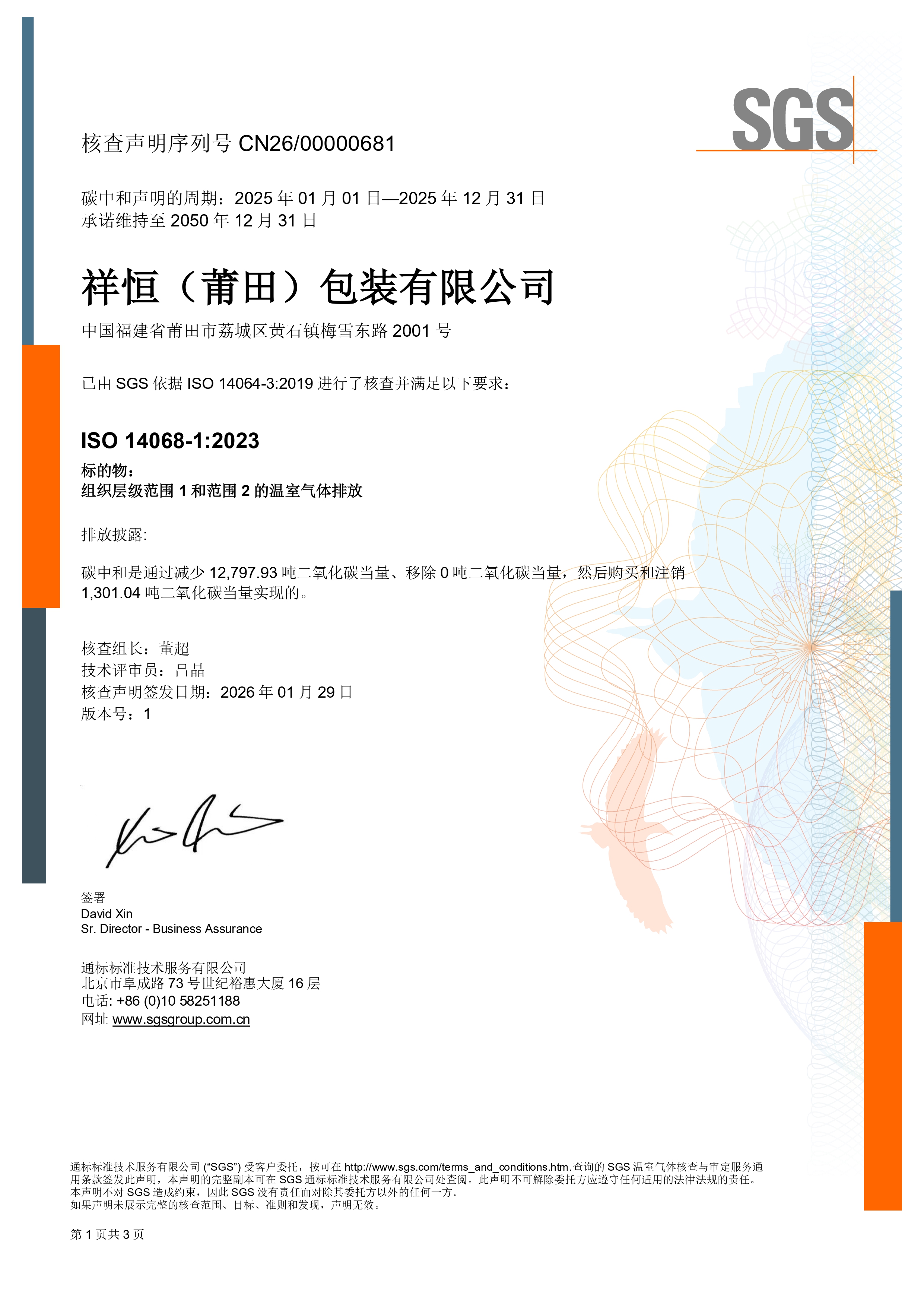 2026年1月14日至16日,SGS委派技术专家及审核老师对莆田祥恒2025年度碳排放相关数据进行独立核查、审定,本次核查范围涉及组织层级范围1和范围2的温室气体排放,严格依据WBCSD/WRI GHG协议及IOS 14068-1:2023(E)的核查准则执行。经核查, 2025年莆田祥恒累计减少二氧化碳当量12797.93吨,移除二氧化碳当量0吨,购买和注销二氧化碳当量1301.04吨,满足相关核查准则要求,SGS审核团队对莆田祥恒2025年减碳工作给予高度评价,并为莆田祥恒颁发碳中和证书。