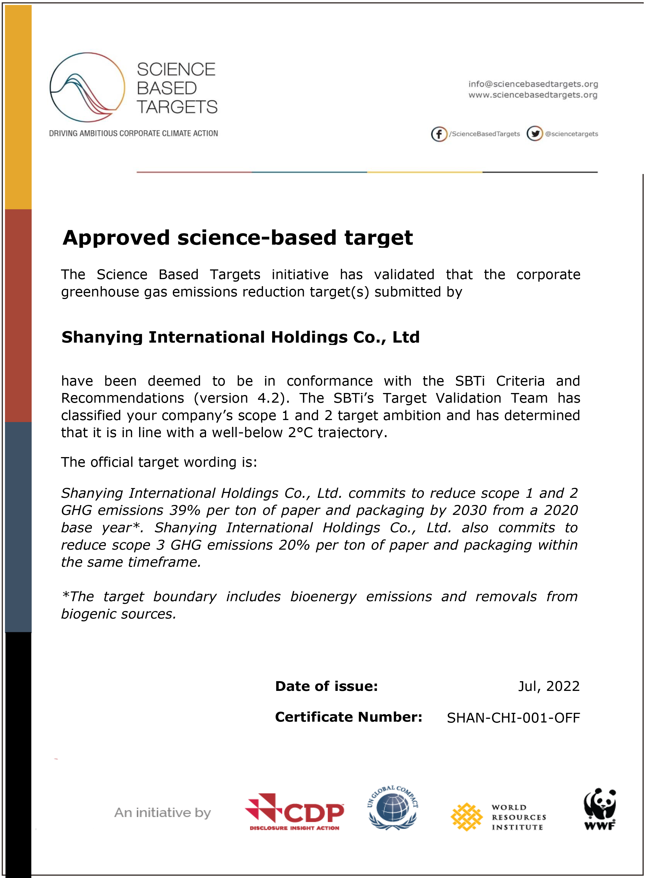 2022年7月,山鹰国际科学碳目标承诺书正式通过审核,成为国内造纸行业率先加入科学碳目标倡议(SBTi)的企业;每年主动开展碳排放盘查和披露,超额完成碳减排目标。